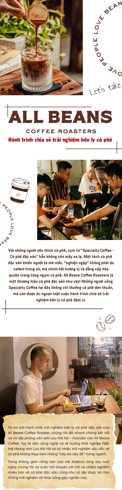 “Để có được một tách cà phê chất lượng nhất, đội ngũ của All Beans phải lựa chọn các loại hạt cà phê được cupping chấm điểm cao, biết được nguồn gốc của hạt cà, tự rang, tự pha chế - hạt cà sau khi rang xong được phục vụ trực tiếp đến tay khách hàng” - anh Hà chia sẻ thêm. Và một công thức thành công nữa của All Beans Coffee chính là luôn luôn lắng nghe những trải nghiệm của khách hàng, từ đó cải tiến hương vị sản phẩm phù hợp hơn.