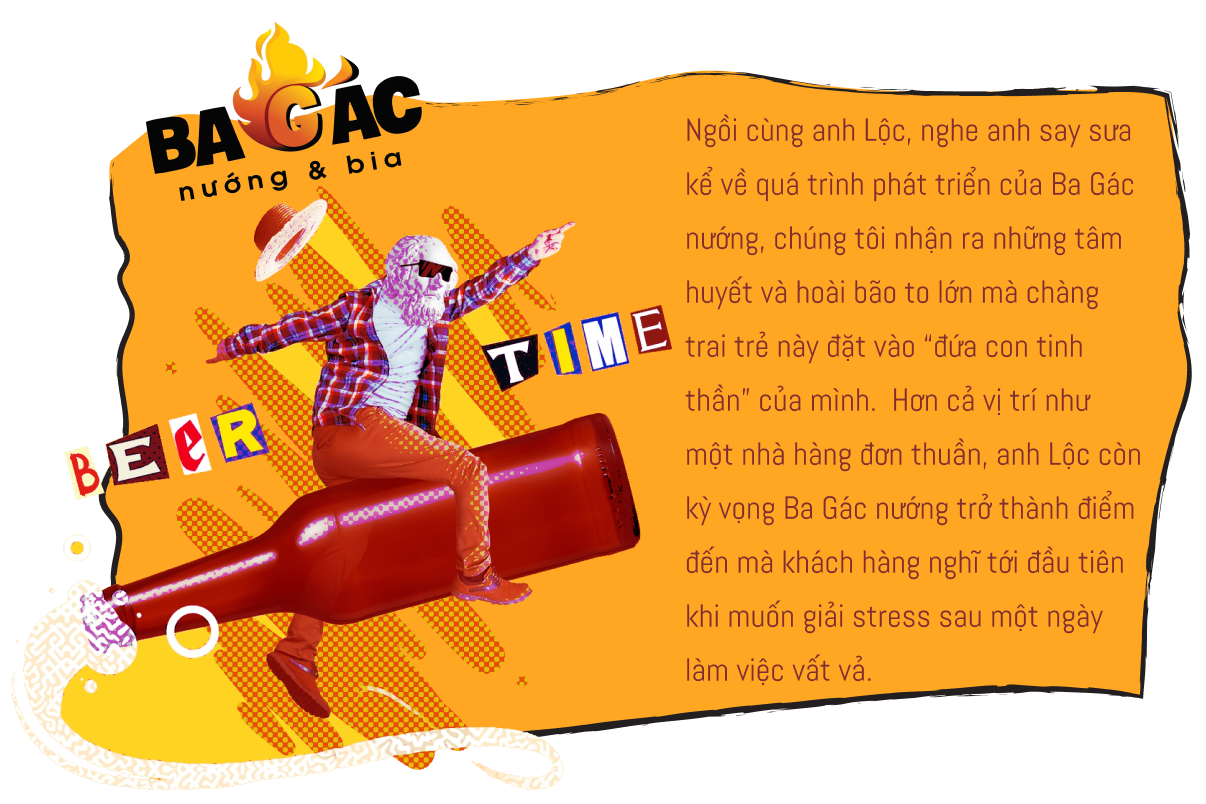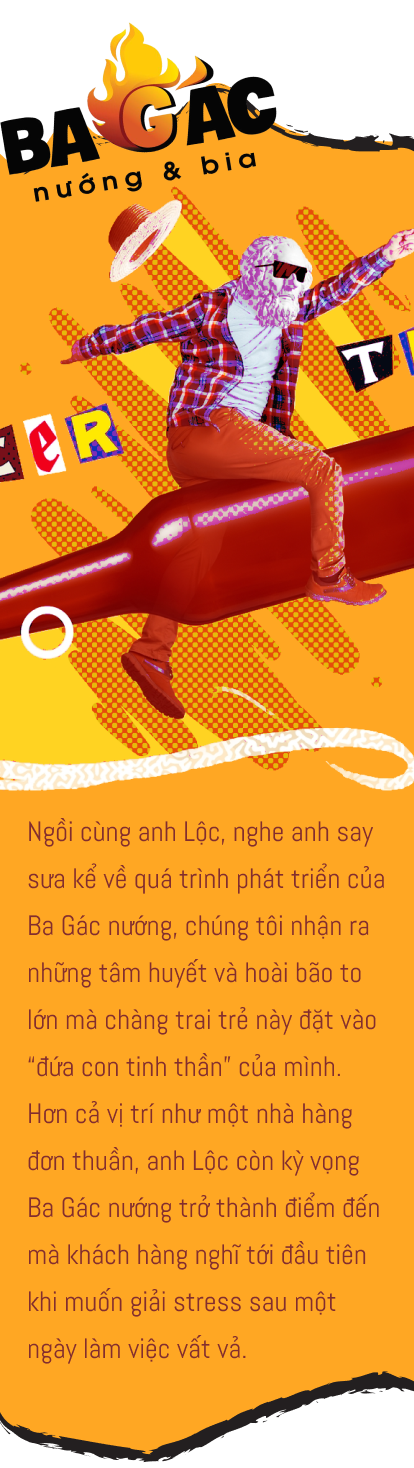 Phần đông khách hàng tìm đến Ba Gác nướng - chuỗi bia vườn nổi tiếng nhất nhì Sài thành - có lẽ cũng vì lý do ấy. Ba Gác nướng có bia tươi, có món nhắm ngon để lai rai, có trải nghiệm “đậm chất Việt” giao thoa giữa ẩm thực, không gian và nghệ thuật. Vậy nên người ta mới nói, đến Ba Gác nướng là để gác ba điều: Gác âu lo, Gác muộn phiền, Gác vai nhau chia sẻ niềm vui. Đó cũng chính là “kim chỉ nam” mà Co-founder của Ba Gác nướng - anh Lộc - đặt ra cùng với các cộng sự từ ngày đặt những viên gạch đầu tiên cho Ba Gác nướng.