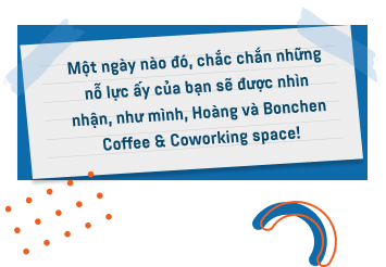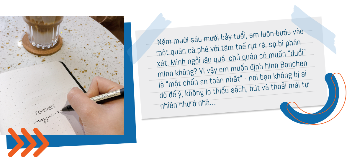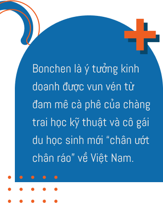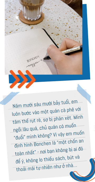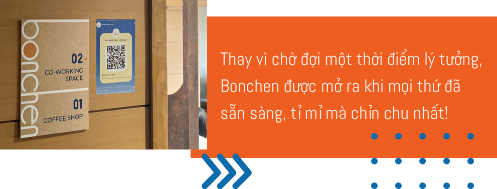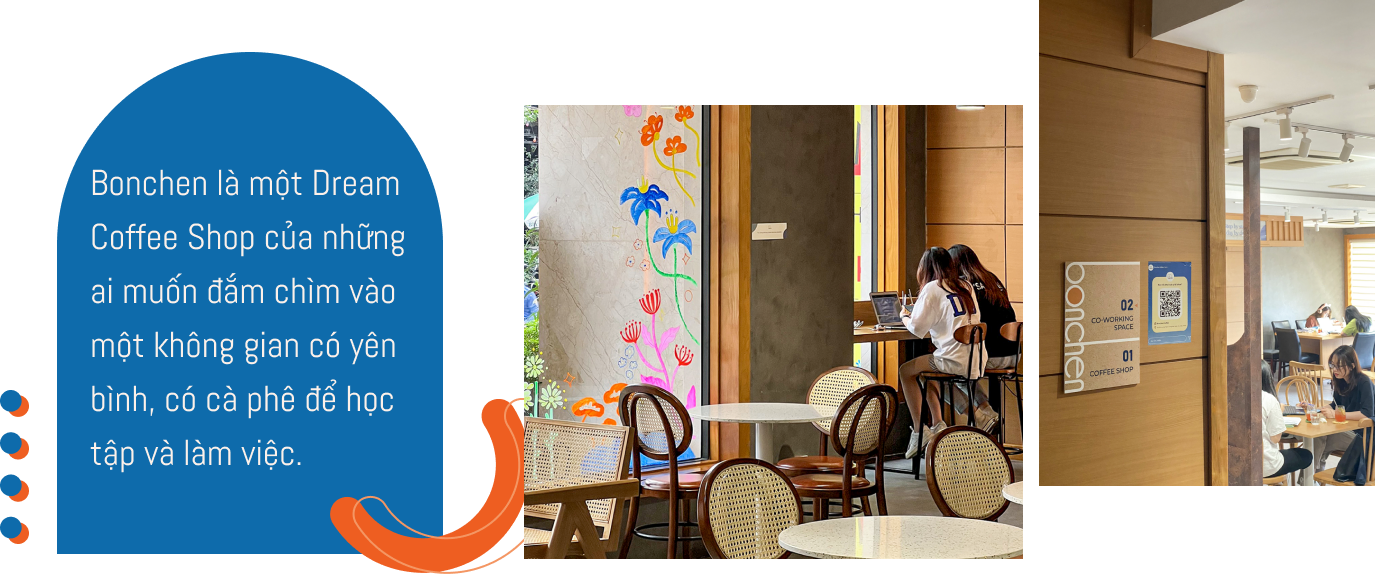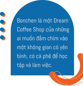 Một điều nữa khiến em nung nấu ý định khởi nghiệp cà phê là: Sở hữu riêng cho mình một Dream Coffee Shop. Lý do bởi, em từng đi rất nhiều quán cà phê trong và ngoài nước, nhưng chưa có một nơi nào thực sự đáp ứng đủ các nhu cầu của em về thức uống, không gian và trải nghiệm dịch vụ. Bonchen là Dream Coffee Shop của em, nhưng sẽ là chốn thân thuộc của mọi người - những ai đang tìm kiếm một nơi yên bình để thưởng thức cà phê rồi chìm đắm vào học tập và công việc.