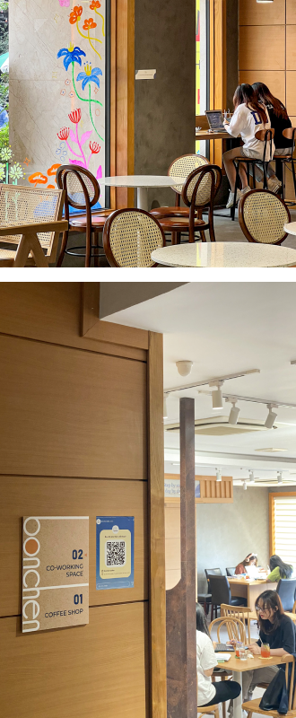 Tầng 1 là mô hình quán cà phê tập trung vào không gian thoải mái, đồ uống độc đáo và đồ ăn nhẹ thơm ngon. Trong khi đó, tầng 2 sẽ là khu vực yên tĩnh dành riêng để mọi người học tập, làm việc. Đặc biệt, những dụng cụ cần thiết nhất để khách hàng có thể thư thả một ngày dài cũng được bố trí đầy đủ trên các kệ tủ tại Bonchen. Có giấy, có bút, có sách,... và có cả vật dụng cần thiết “ngày đèn đỏ” cho các bạn nữ nữa. Tất cả đều miễn phí để tạo cảm giác thoải mái nhất!