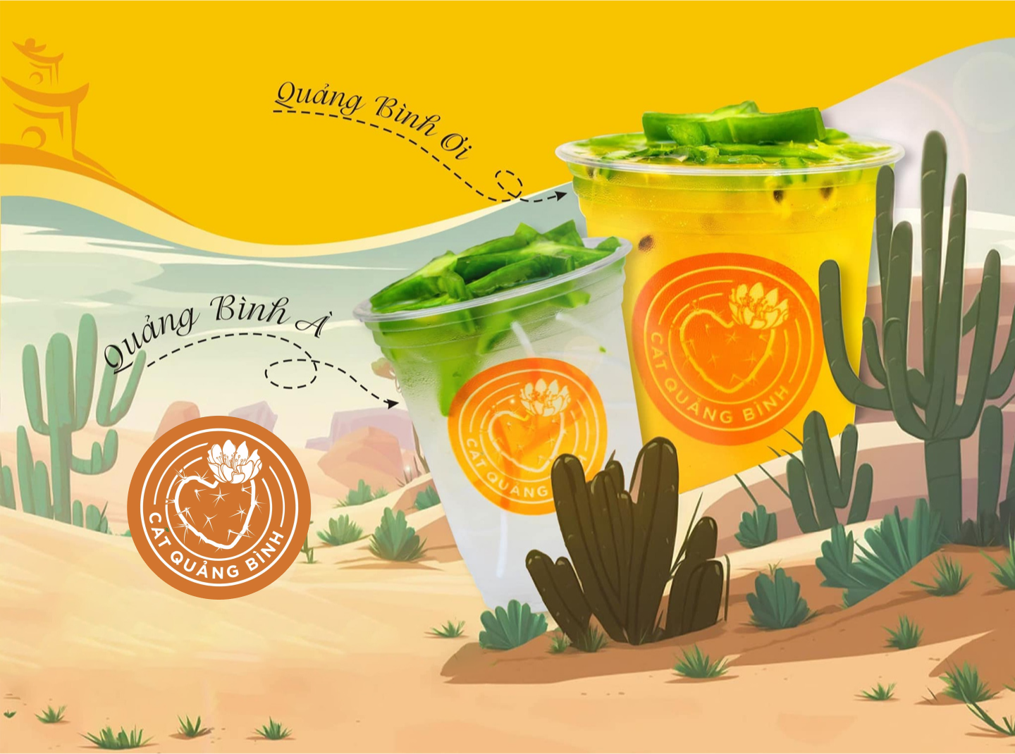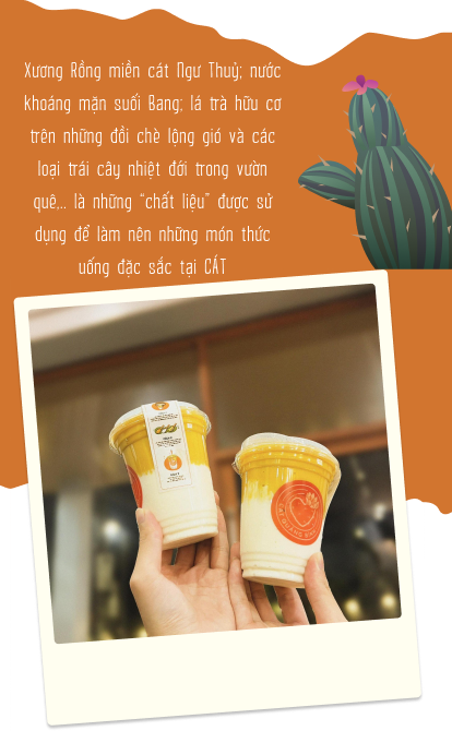 Trong menu của CÁT, làm nên tên tuổi của quán có lẽ phải kể đến Quảng Bình Ơi và Quảng Bình À là hai món Trà Xương Rồng đặc sản. Ngoài ra, còn có món Bí Sáp Dừa Sen và Làm Dâu Trăm Họ (Dâu Sữa Chua Kem Phomai) cũng rất được khách hàng yêu thích.