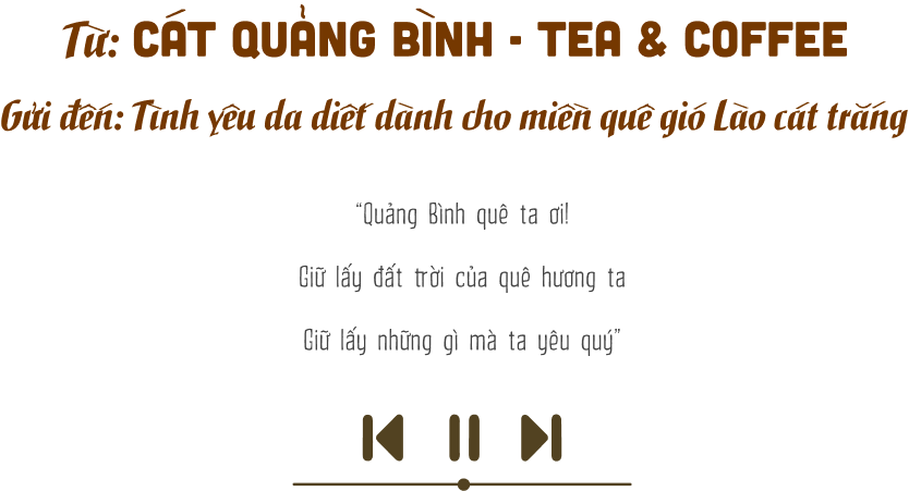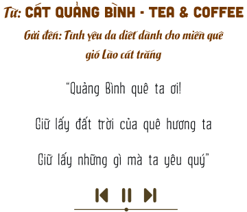 Với những người con Quảng Bình phải xa quê, mỗi khi giai điệu quen thuộc mà da diết này vang lên lại là một lần khắc sâu thêm nỗi nhớ về miền đất “gió lào cát trắng”. Bằng niềm tin yêu mãnh liệt, chị Hồng Nhung cùng đội ngũ của mình đã sáng lập nên thương hiệu CÁT QUẢNG BÌNH Tea & Coffee để mang hình ảnh quê hương đến gần hơn với mọi người.