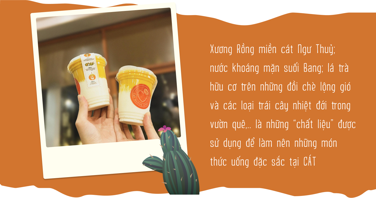 Xuất phát từ sự am hiểu sâu sắc về sản vật quê hương, đội ngũ sáng tạo sản phẩm của CÁT đã góp nhặt những nguyên liệu tự nhiên đặc trưng của miền đất Quảng Bình như: Xương Rồng miền cát Ngư Thuỷ; nước khoáng mặn suối Bang; lá trà hữu cơ trên những đồi chè lộng gió và các loại trái cây nhiệt đới trong vườn quê,... sử dụng làm “chất liệu”  tạo nên những món thức uống đặc sắc.