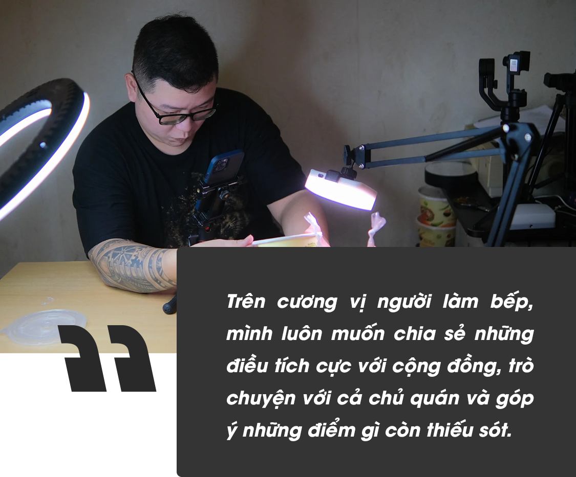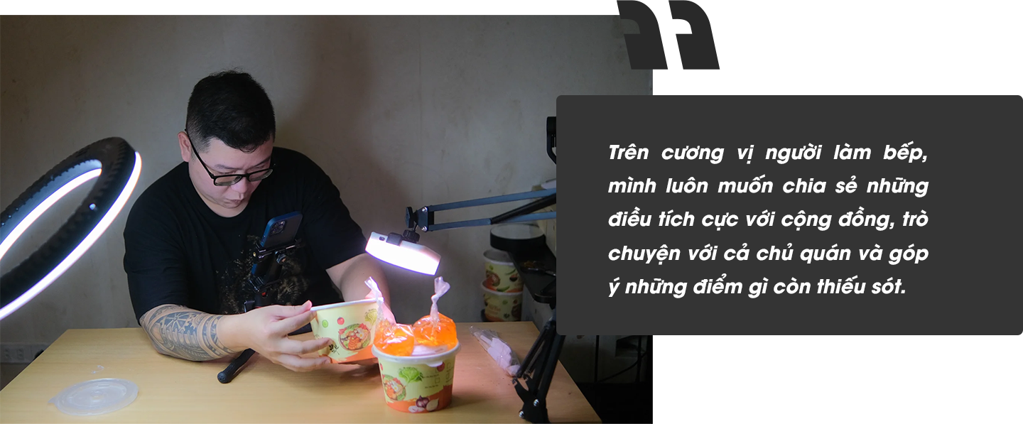 Điều đặc biệt rằng, hầu hết các nội dung của Bếp trưởng Review đều có hậu trường khá tự nhiên. Với sự phát triển của công nghệ, đặc biệt là xu hướng trên các nền tảng video ngắn như TikTok hay Youtube Short, mình chỉ cần duy nhất 1 chiếc điện thoại thôi, không cần đèn, ánh sáng chuyên nghiệp gì đâu (cười). Đúng nghĩa là mình đến ăn, quay lại những gì mình nhận được, và xin phép chủ quán quay một số góc bếp, vậy thôi.