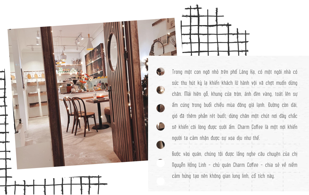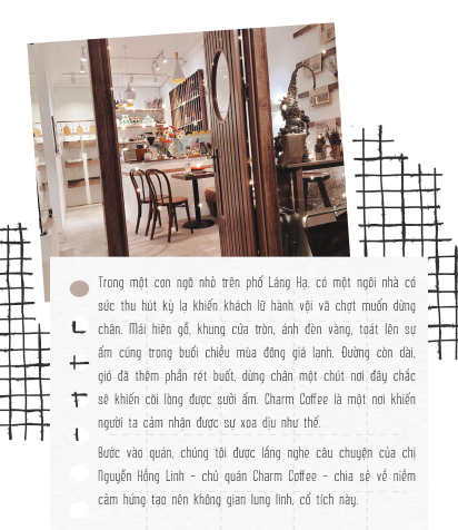Tình cờ có hôm đi với bạn vào con ngõ 20 Láng Hạ, chị thấy một ngôi nhà tại đây treo biển cho thuê. Chị rất ấn tượng với ngôi nhà này, tự nhiên thấy một sự gắn kết kỳ lạ. Căn nhà cho thuê nằm trong một con ngõ vắng vẻ, yên tĩnh, có rất nhiều cây cối xung quanh, tách biệt hoàn toàn với những ngôi nhà cao tầng, bầu không khí khói bụi, tắc đường, xô bồ, náo nhiệt bên ngoài. Ngay lúc đó trong đầu chị đã hình dung đến việc mở một quán coffee tại chính nơi này và Charm Coffee đã ra đời như thế!