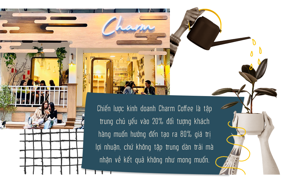 Chia sẻ thêm một chút về tệp khách hàng của Charm Coffee, ngay từ thời điểm đầu chị đã định hình được đối tượng mà chị muốn hướng tới là ai. Quan điểm và chiến lược của chị khi kinh doanh, chị sẽ tập trung chủ yếu vào 20% lượng khách hàng mà Charm Coffee hướng đến để giúp tạo ra 80% giá trị lợi nhuận, chứ không tập trung dàn trải, nhiều đối tượng để thu về kết quả không hiệu quả như mong muốn.