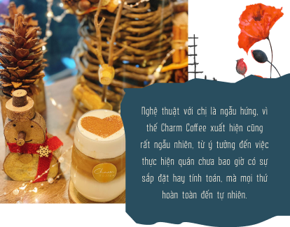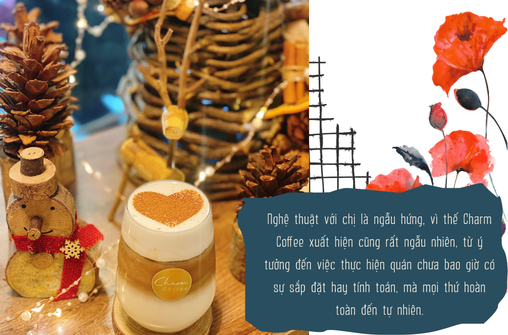 Theo chị, nghệ thuật là ngẫu hứng vì thế Charm Coffee xuất hiện cũng rất ngẫu nhiên, trong suy nghĩ của chị từ ý tưởng đến việc thực hiện hóa quán chưa bao giờ có sự sắp đặt hay tính toán, mà mọi thứ hoàn toàn đến tự nhiên. Chị nghĩ không ai là không yêu thích cái đẹp và nghệ thuật, nhưng mỗi người sẽ có cách chiêm nghiệm và tận hưởng khác nhau.