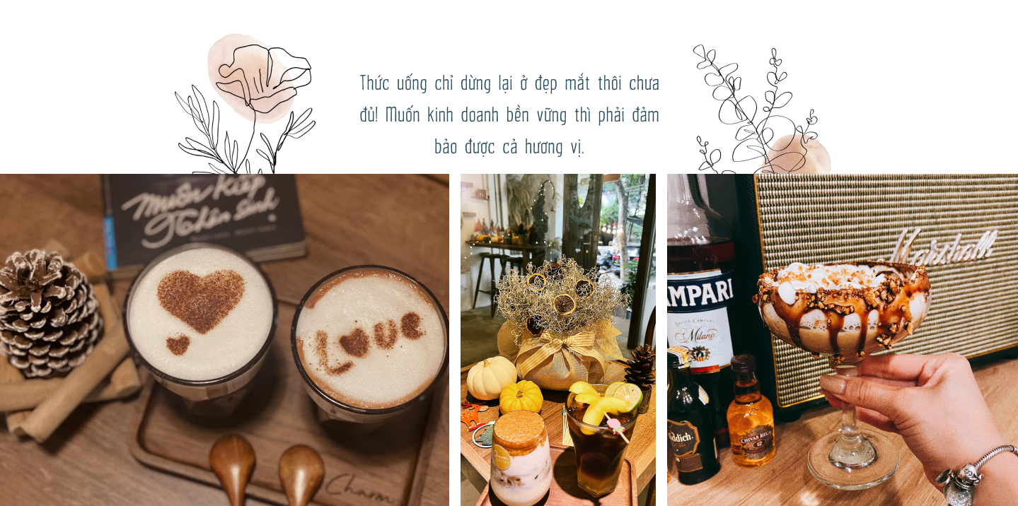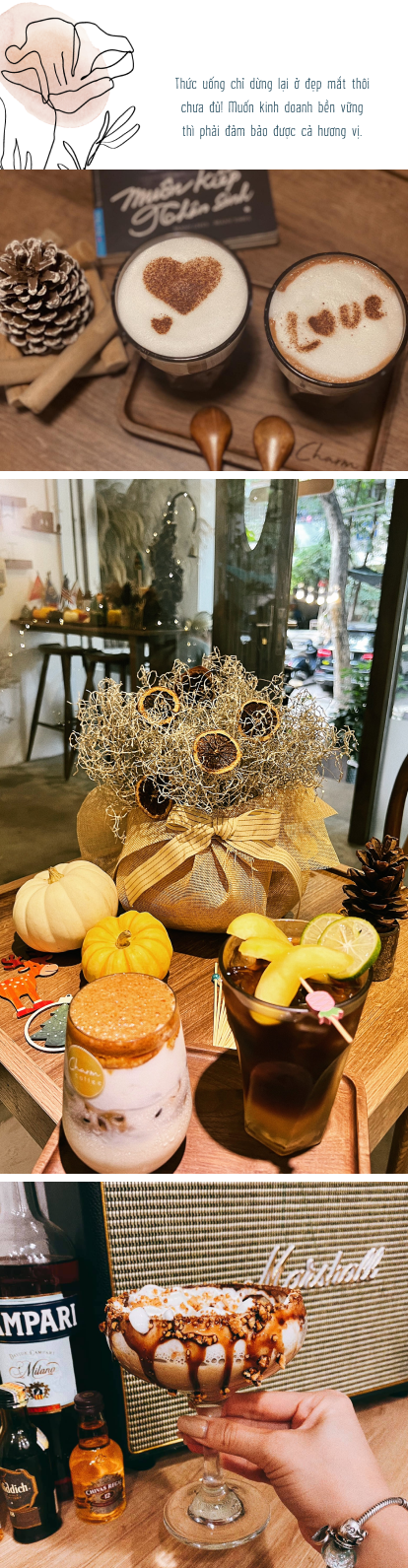 Còn với Charm Coffee, đồ uống không để phục vụ mục đích check-in sống ảo. Theo chị, đồ uống chỉ dừng lại ở đẹp mắt thôi sẽ không thể thuyết phục khách hàng quay trở lại và giữ chân họ trong lần tiếp theo, muốn kinh doanh bền vững thì phải đảm bảo được cả hai yếu tố.