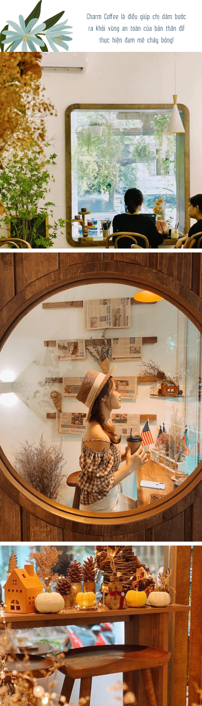 Charm Coffee được chị ấp ủ từ khi đó. Một ngôi nhà gỗ, có cây cối bao phủ xung quanh, trong quán là bầu không khí ấm cúng và gần gũi với những bản nhạc du dương, không gian và đồ uống của quán được decor lung linh, đầy tính nghệ thuật, thu hút một cách lạ kỳ.