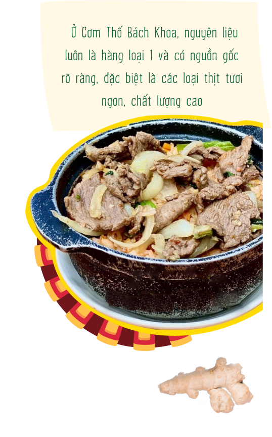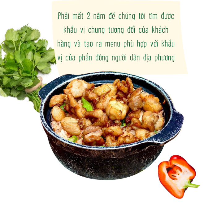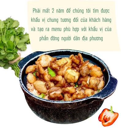 Phải mất 2 năm để chúng tôi tìm được khẩu vị chung tương đối của khách hàng và tạo ra menu phù hợp với khẩu vị của phần đông người dân địa phương. Mặc dù cơm thố chỉ là món ăn cơ bản nhưng chúng tôi phải học cách biến tấu để hợp với khẩu vị của người dân miền Bắc và không làm mất đi đặc trưng nguyên bản của món cơm.