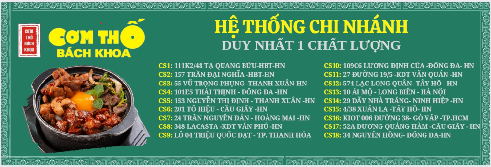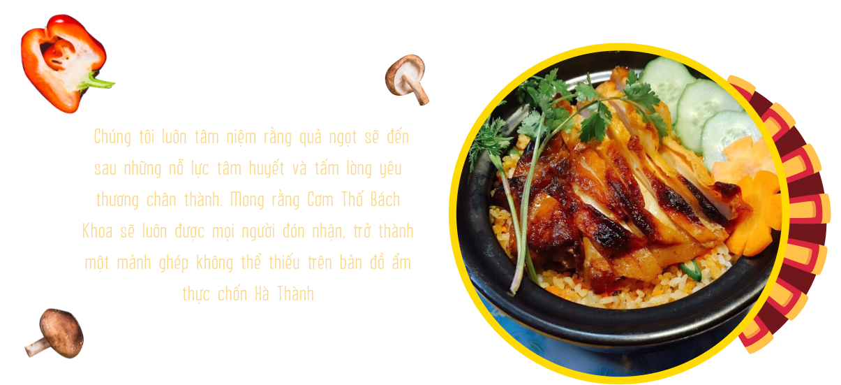 Về sau này, khi sức ảnh hưởng và mô hình cơm thố phát triển mạnh ở Việt Nam, chúng tôi đã chuyển cửa hàng và định cư tại khu vực Tạ Quang Bửu, Bách Khoa - khu phố khá lâu đời của Hà Nội. Đồng thời, khi đó cũng quyết định lựa chọn “Cơm Thố Bách Khoa” làm tên thương hiệu để tạo cảm giác thân thuộc, gần gũi với người dân đất Hà Thành.