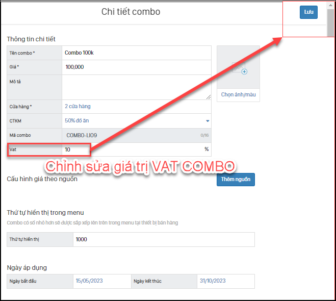 Thao tác: Chương trình / Combo / Chọn combo cần sửa / Sửa thông tin VAT món / Chọn “Lưu”