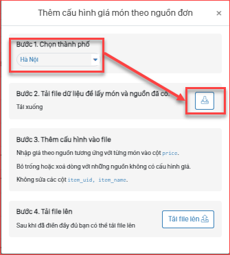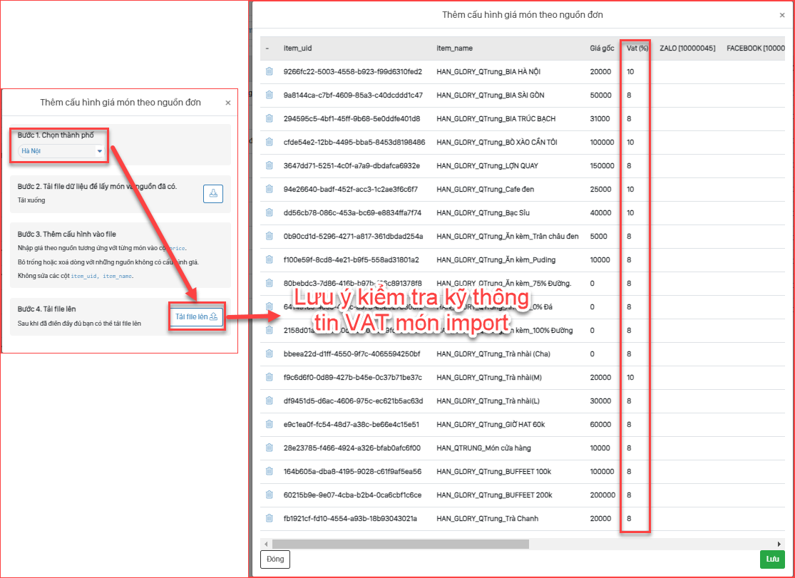 Thao tác import dữ liệu : Thực đơn / Danh sách món ăn Cửa hàng hoặc Thành Phố / Tiện ích / Cấu hình giá theo nguồn / Chọn thành phố cần cấu hình/ Tải file lên / Kiểm tra kỹ thông tin VAT món / Chọn “Lưu”