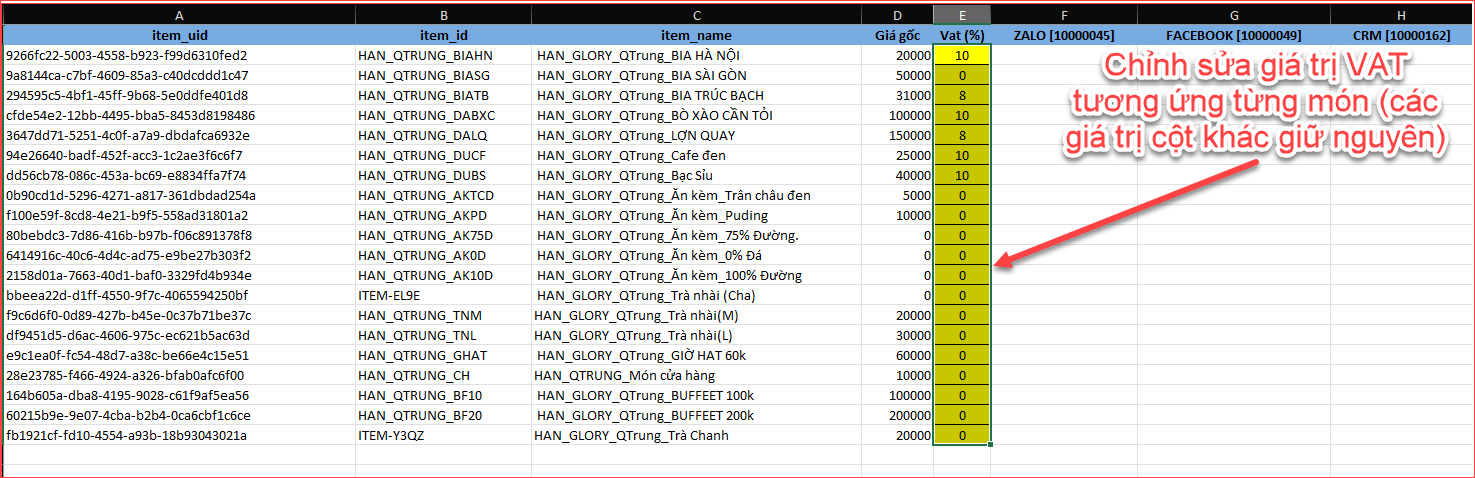 Xuất file danh sách món ăn để thay đổi giá trị VAT
