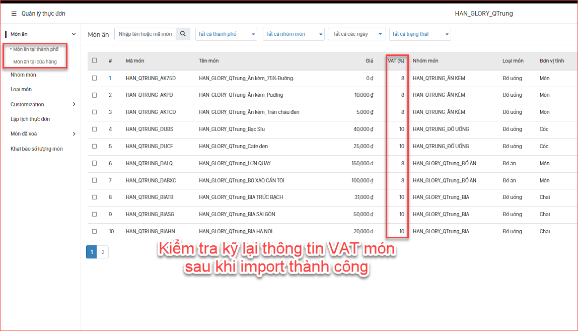 • Sau khi import thành công dữ liệu, Quý khách vui lòng kiểm tra đầy đủ thông tin VAT món, đảm bảo dữ liệu đầy đủ và chính xác