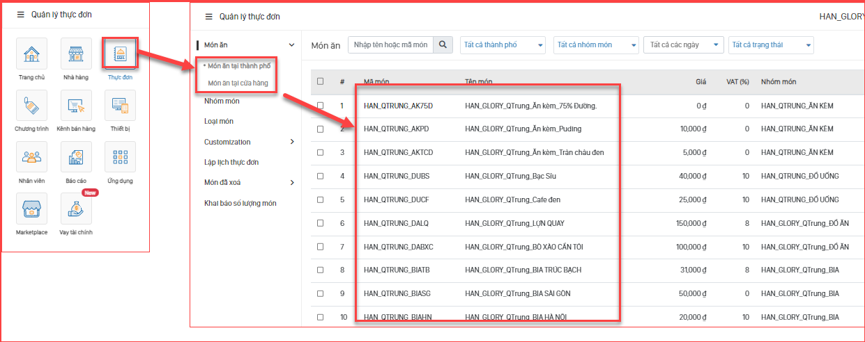 Thao tác: Thực đơn / Danh sách món ăn Cửa hàng hoặc Thành Phố / Chọn món cần sửa / Sửa thông tin VAT món / Chọn “Lưu”