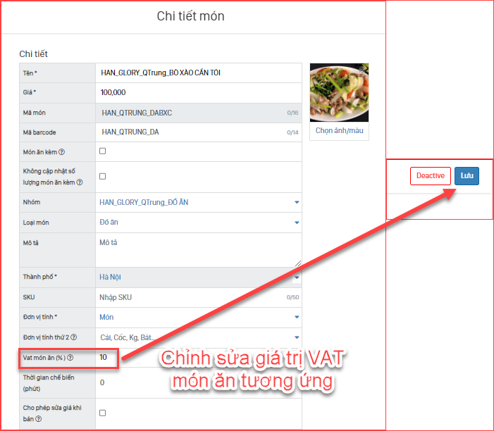 • Bước 5: Chỉnh sửa lại giá trị VAT món ăn tương ứng