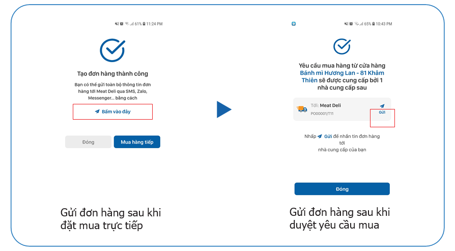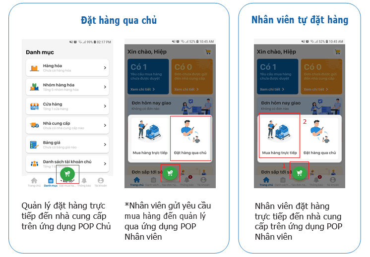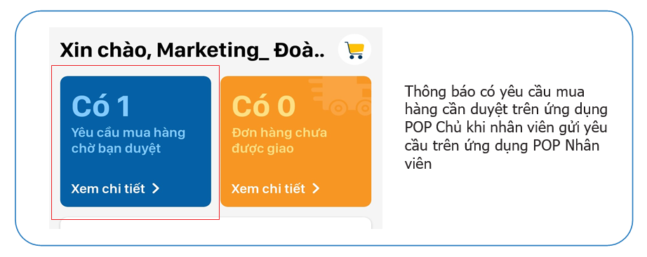 *Khi nhân viên yêu cầu mua hàng (qua ứng dụng POP Nhân viên) – chủ cửa hàng phải có thao tác duyệt yêu cầu trên ứng dụng POP Chủ thì đơn hàng mới được chấp thuận và gửi đi tới nhà cung cấp.