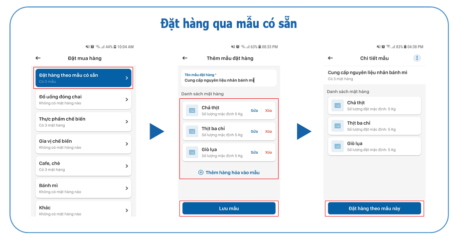 - Đặt hàng qua mẫu có sẵn: Phù hợp để đặt mua những đơn hàng định kỳ, có số mặt hàng và khối lượng không đổi. Chẳng hạn, bạn kinh doanh quán phở, mỗi ngày đều nhập 10kg bánh phở và 5kg thịt bò. Lúc này, bạn nên tạo mẫu đặt hàng để hạn chế việc phải đặt mua riêng lẻ.