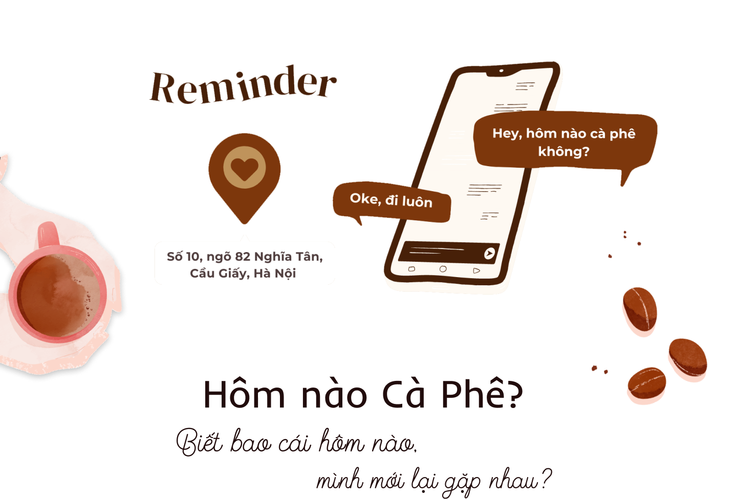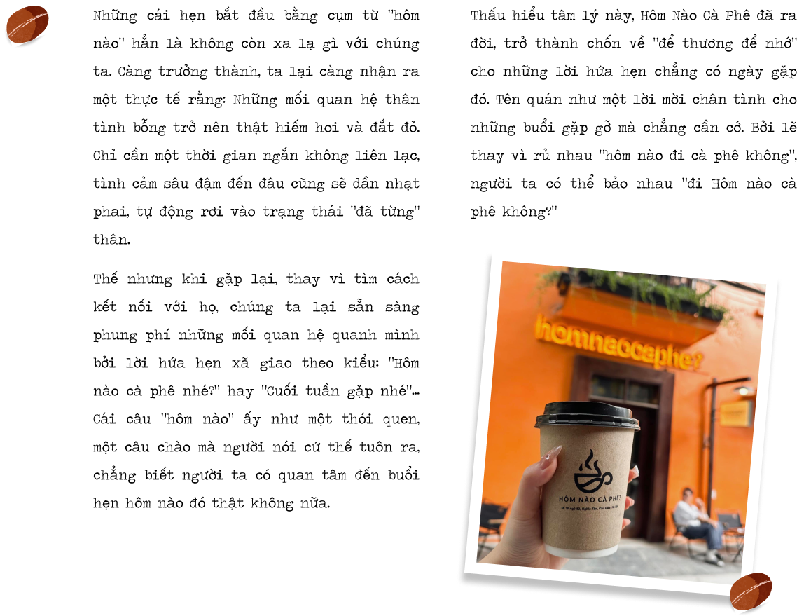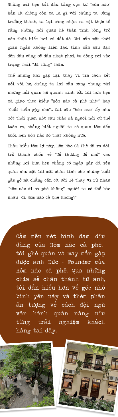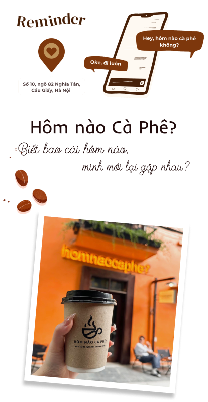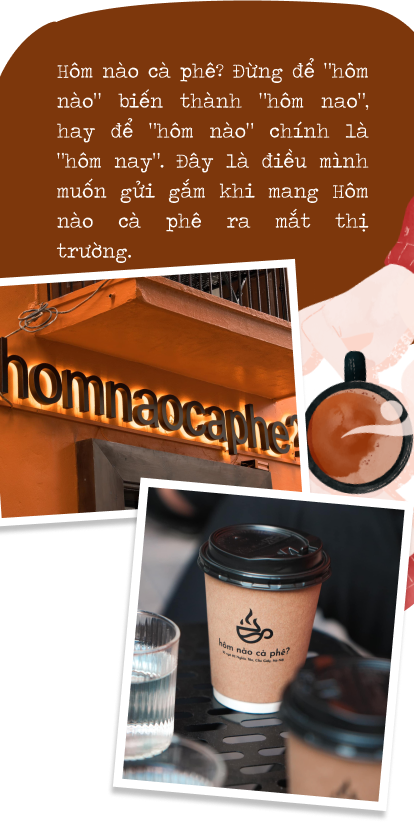 Hơn nữa, khi ấp ủ ý tưởng mở quán tiếp theo, mục đích của mình là tạo ra một thương hiệu gần gũi, đánh trực tiếp vào đời sống hàng ngày và được nhắc tới thường xuyên, dễ nhớ, dễ gọi. Nên thay vì sáng tác ra những câu chuyện phải dẫn dắt rất xa thì người nghe mới nhớ được tên, mình chọn một câu hỏi quen thuộc thường ngày giữa bạn bè với nhau, rằng hôm nào cà phê không?