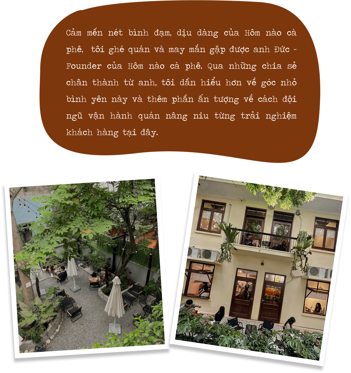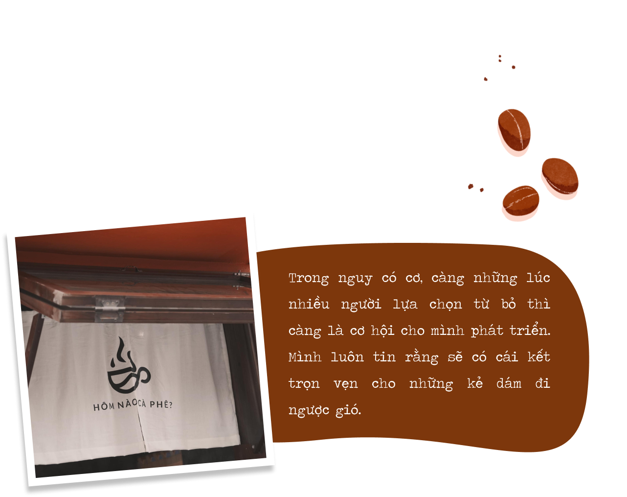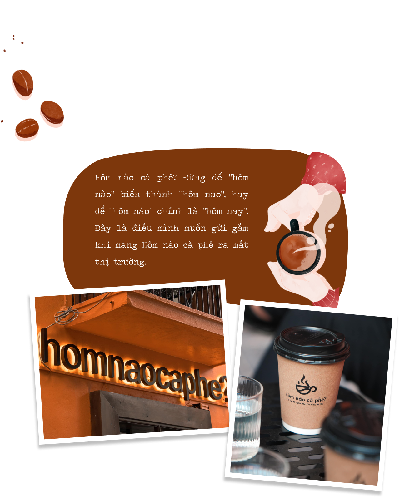 Hơn nữa, khi ấp ủ ý tưởng mở quán tiếp theo, mục đích của mình là tạo ra một thương hiệu gần gũi, đánh trực tiếp vào đời sống hàng ngày và được nhắc tới thường xuyên, dễ nhớ, dễ gọi. Nên thay vì sáng tác ra những câu chuyện phải dẫn dắt rất xa thì người nghe mới nhớ được tên, mình chọn một câu hỏi quen thuộc thường ngày giữa bạn bè với nhau, rằng hôm nào cà phê không?
