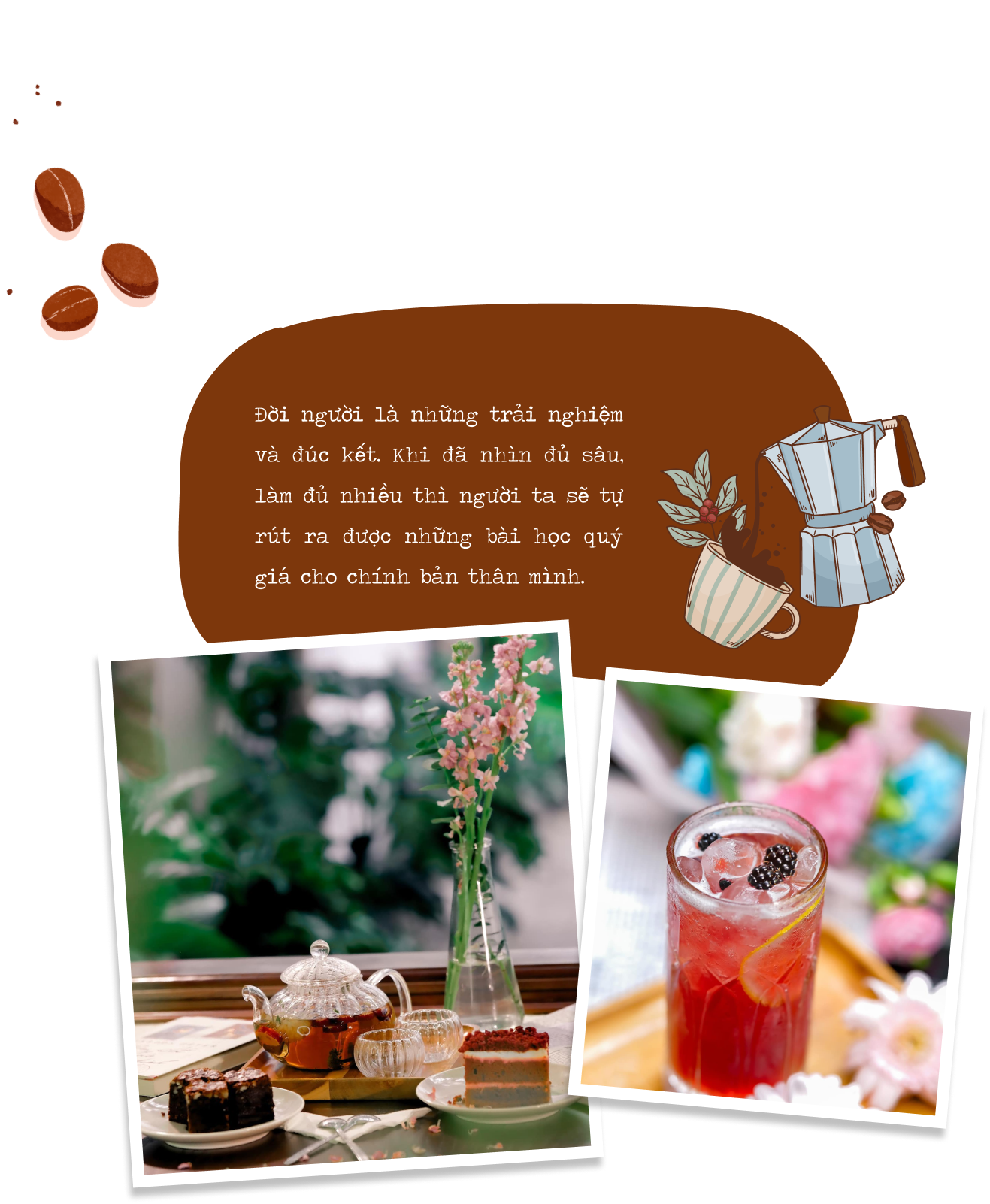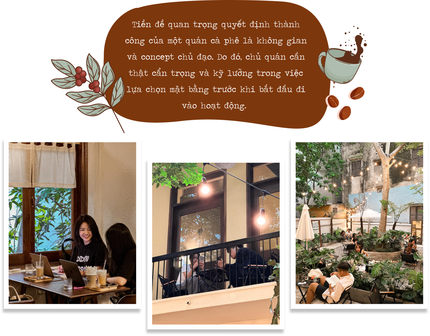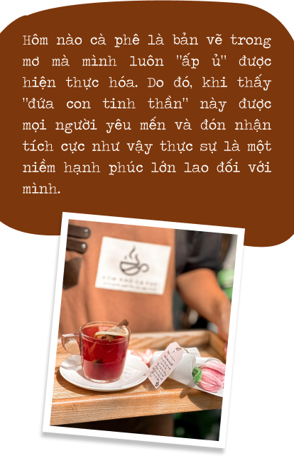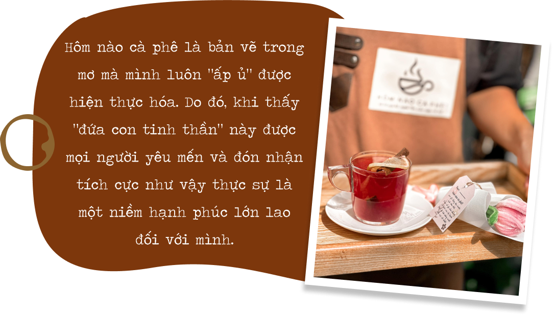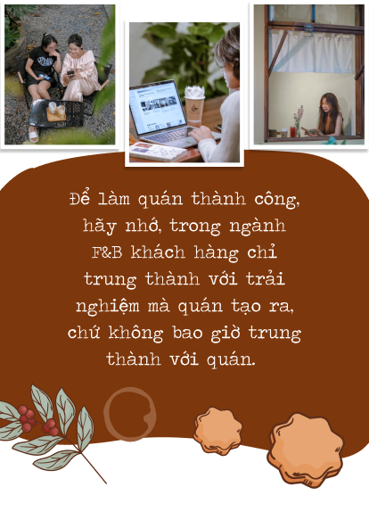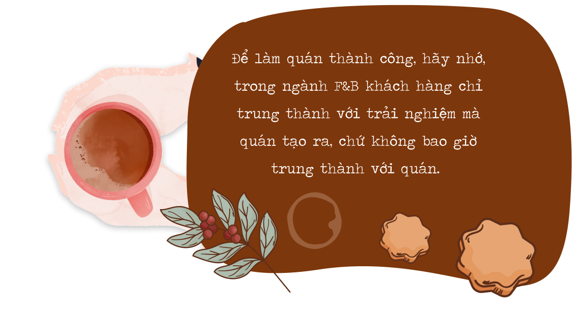 Với kinh nghiệm làm quán và đi cà phê suốt bao năm qua, mình nhận ra rằng đồ uống chỉ chiếm khoảng 20 - 30% lý do khách hàng đến và ở lại lâu dài với một quán cà phê. Vì vậy, bên cạnh chất lượng đồ uống thì mình cũng tập trung khá nhiều nguồn lực vào việc phát triển các dịch vụ còn lại như không gian quán, phong cách phục vụ, bầu không khí,... Ví dụ như khi khách hàng đến quán và được nhân viên phục vụ tận tình hay không gian quán mình “chuẩn gu” của họ thì người ta sẽ có khả năng quay lại cao hơn, thậm chí là ghé thường xuyên và trở thành khách quen. Bởi lẽ những trải nghiệm khách hàng tích cực tại đây sẽ hình thành những ký ức tốt cho mọi người, khiến họ có cái nhìn thiện cảm hơn với quán của mình.