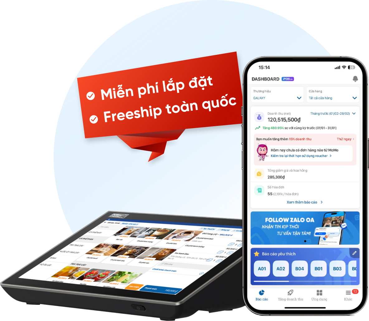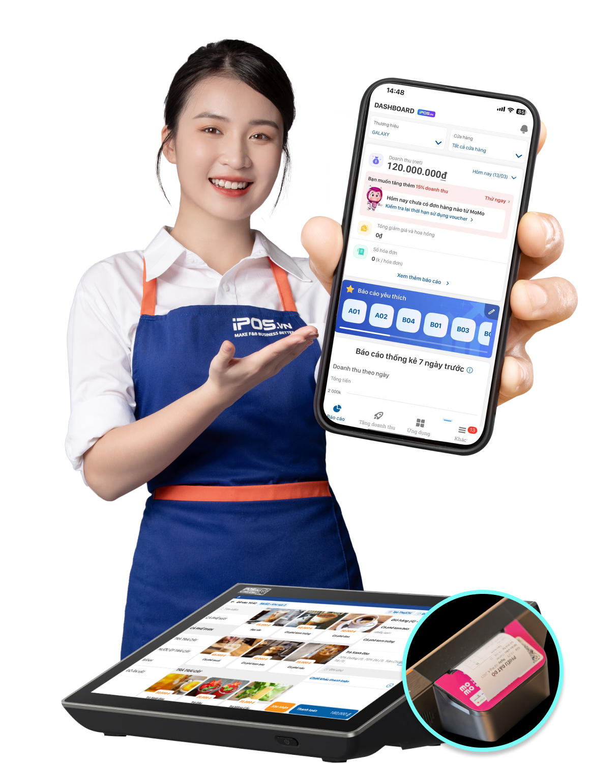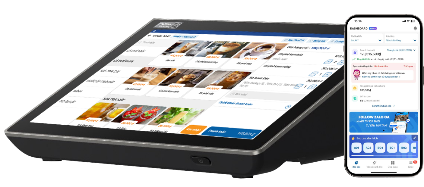 - Tích hợp thanh toán QR MoMo đa năng và loa thông báo giao dịch trên máy POS, kiểm soát dòng tiền chặt chẽ.