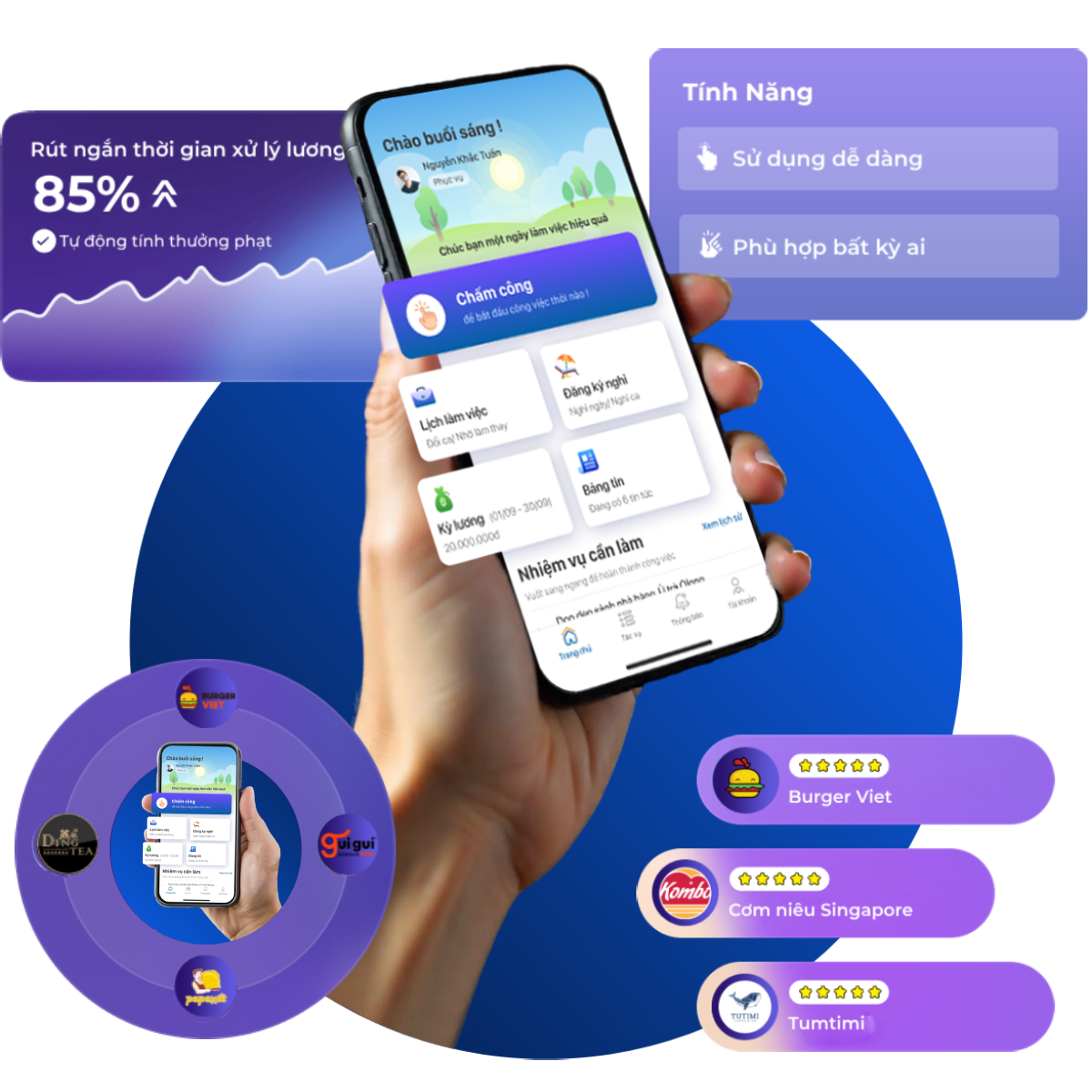 Ứng dụng trên điện thoại rất tiện lợi! Tôi theo dõi được giờ chấm công theo thời gian thực, giao việc và duyệt ca linh hoạt, không cần có mặt tại quán. Mọi thứ rõ ràng, minh bạch.