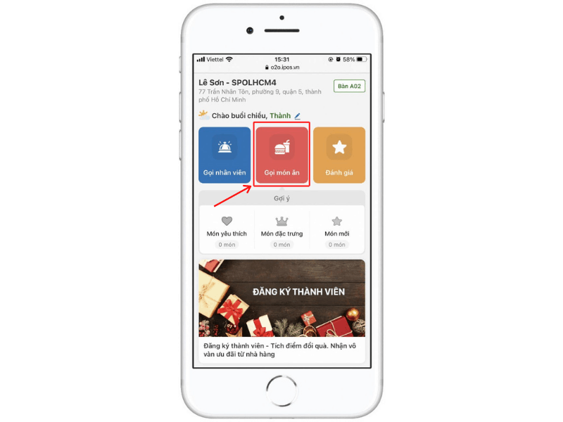 Bước 2: Lựa chọn Gọi món trên giao diện