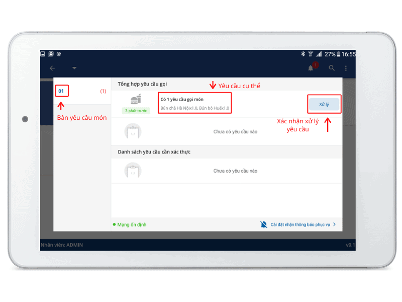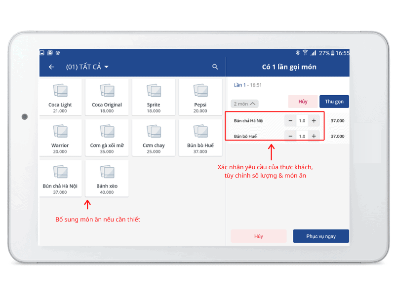 Sau khi thực khách đã xác nhận gọi món thành công, nhân viên phục vụ thao tác trên giao diện phần mềm PDA Order (thường được sử dụng thông qua thiết bị Máy tính bảng).