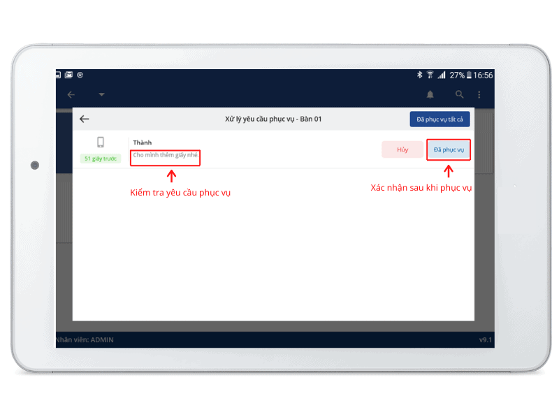 Bước 2. Kiểm tra yêu cầu phục vụ (nếu có) và xác nhận sau khi phục vụ