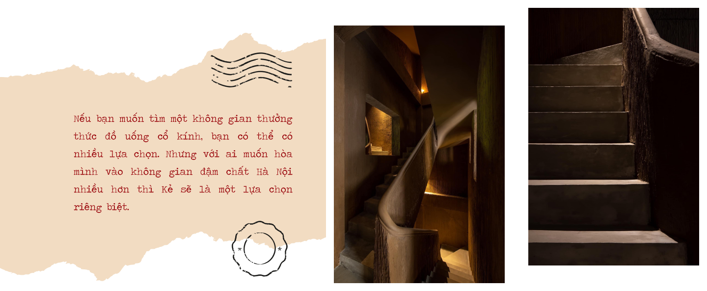 Tại Kẻ có cà phê, có trà, có bạn, không còn ồn ào, tắc đường, kẹt xe hay deadline ngập đầu... bỏ lại những phiền phức của nhịp sống đương đại. Đến với Kẻ là để nép mình vào những góc cổ kính, xưa cũ, êm đềm và chậm rãi để nhâm nhi chén trà, tách cà phê quây quần bên bạn bè, người thân.