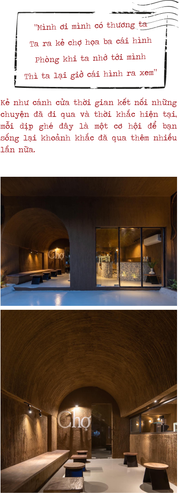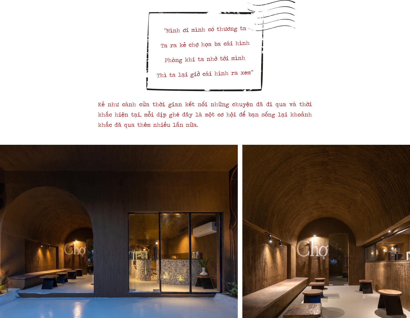 Kẻ Chợ cũng được tái hiện phần nào đó trong không gian quán, như thể tạo nên một cánh cửa thời gian giao thoa giữa không khí xưa cũ và hơi thở hiện đại, để mỗi khách hàng tới đây đều có cơ hội trở về thuở ban sơ, một lần nữa bâng khuâng, bồi hồi rồi lưu luyến.