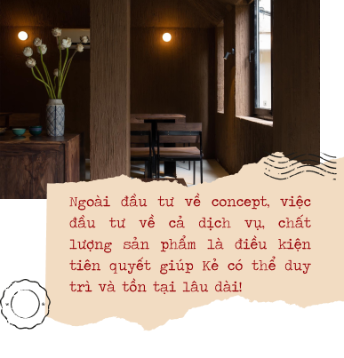 Việc mình đầu tư vào concept có chiều sâu, có câu chuyện, sẽ có lợi thế cụ thể. Bởi sau khi thưởng thức hình ảnh đẹp, khách sẽ vẫn có thứ để khám phá thay vì rời đi. Khi thấu hiểu và hài lòng, khách hàng cũng trân trọng tâm huyết mà quán tạo nên. Tất nhiên, khía cạnh quan trọng khác vẫn là chất lượng đồ uống, thái độ phục vụ,...