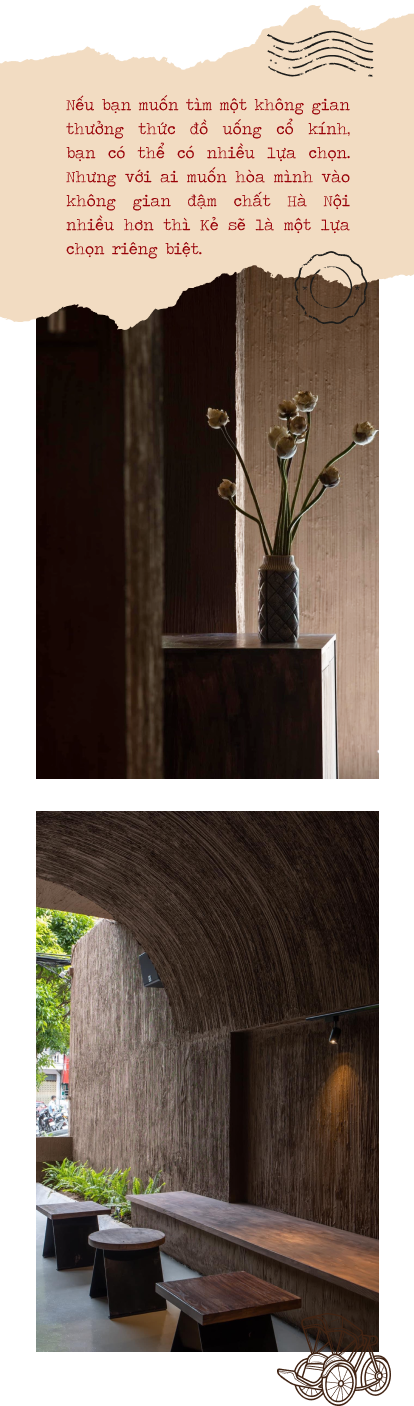 Kẻ Cà Phê đi theo hướng tái hiện hình ảnh những ngôi nhà ở làng quê Bắc Bộ cổ xưa: từ mái vòm cổng cổ kính với cây hoa giấy phớt hồng uốn quanh, quầy bar ốp bằng sứ Bát Tràng, bộ bàn ghế bằng gỗ nâu mộc mạc và những bình huệ hay lọ sen để trang trí trong quán,... Quan sát kỹ sẽ thấy, trần nhà của Kẻ khá thấp phù hợp với lối kiến trúc lưu trú ngày xưa của người Việt Nam, tạo sự gần gũi cho khách hàng. Hay chất liệu tường là những vết xước màu nâu của đất, gợi nhớ lại những ngôi nhà cổ. Và sự kết hợp 2 cầu thang song song khi lên tầng cũng là lối kiến trúc nhà thời xưa. Mỗi không gian ở các khu vực tại Kẻ đều là những không gian thưởng thức khác nhau, để mỗi khi ghé Kẻ, khách hàng sẽ không cảm thấy bị nhàm chán.