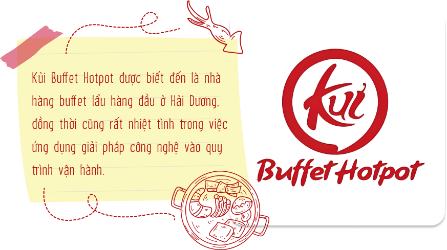 Kủi Buffet Hotpot - nhà hàng hoạt động theo mô hình buffet lẩu ngồi tại bàn gọi đồ - đang là một trong những tên tuổi F&B tiên phong trong việc đưa công nghệ vào quy trình vận hành ở Hải Dương. Với tư duy nhạy bén, nắm bắt những thay đổi từ thị trường F&B trong nước và quốc tế, ngay từ khi mới mở dịch vụ buffet, chị Hạnh - founder của thương hiệu Kủi Buffet Hotpot đã suy nghĩ tới việc phải ứng dụng các giải pháp công nghệ để nâng cao chất lượng hoạt động, cũng như giúp nhà hàng vận hành trơn tru hơn.