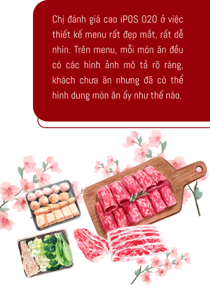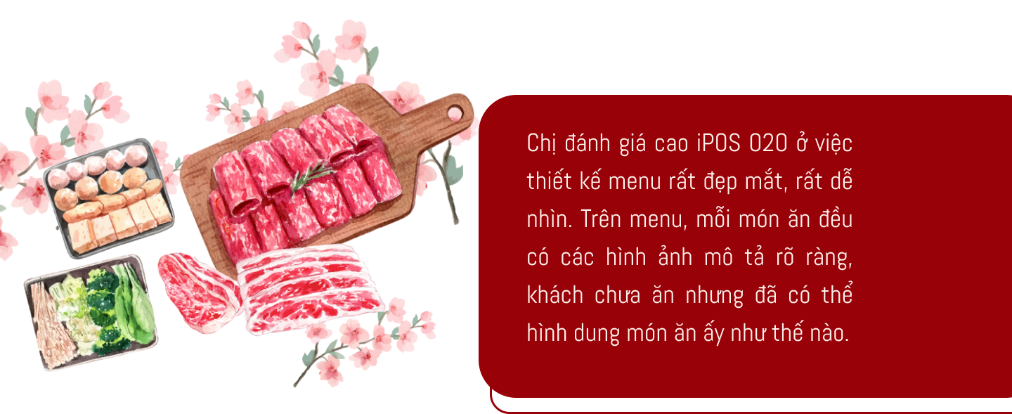 Khi sử dụng iPOS O2O, thực khách chỉ cần quét mã QR code là đã có thể xem được tất cả hình ảnh chi tiết về một món ăn, thông tin và giá tiền mà không cần phải mất công gọi hỏi nhân viên như trước. Chị nghĩ khách hàng nào cũng sẽ bị thuyết phục để “rút ví” bởi sự rõ ràng, cụ thể ấy.”