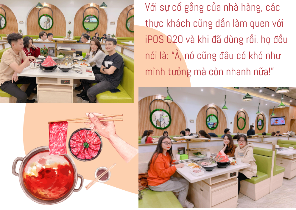 Nhưng rồi anh chị vẫn kiên trì với nhận định: khi công nghệ quét mã QR code ngày một gần gũi với đời sống hơn thì việc sử dụng những sản phẩm như iPOS O2O cũng trở thành điều phổ biến trong các nhà hàng buffet lẩu. Mình triển khai trước thì sẽ có lợi thế là gây ấn tượng mạnh cho khách hàng hơn, đồng thời dễ dàng biến nó thành signature của riêng nhà hàng.