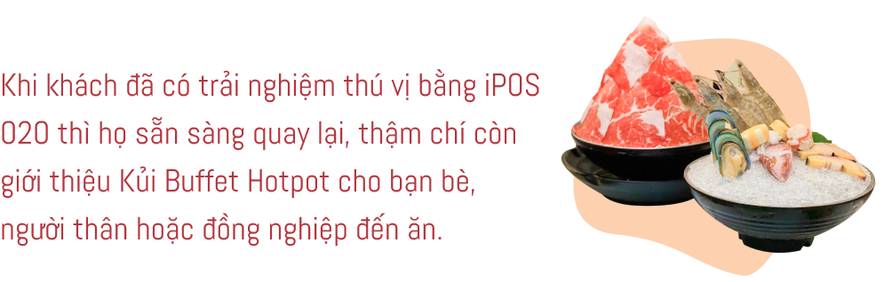 Kủi Buffet Hotpot là một trong những trường hợp tiêu biểu nhất đã ứng dụng giải pháp công nghệ như iPOS O2O trong quy trình vận hành để nâng cao trải nghiệm khách hàng. Thành công này là minh chứng rõ ràng cho việc các nhà hàng, quán cà phê thời 4.0 nên từng bước chuyển mình, xây dựng chiến lược lấy khách hàng làm trung tâm để có thể bứt phá, tìm lối đi riêng trên thị trường F&B hiện nay.