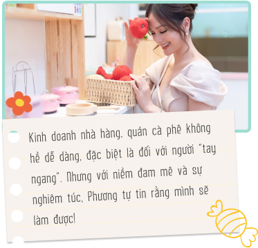 Trong kinh doanh, Phương là người rất cầu toàn và luôn kiên định với giá trị tạo ra cho khách hàng, nên không có chuyện mải mê tập trung vấn đề này mà xao nhãng vấn đề khác. Nhờ sự tư vấn của chồng Phương - một người có nhiều năm kinh nghiệm trong lĩnh vực nhà hàng, khách sạn nên mình khá tự tin về chất lượng và hương vị của các món ăn, đồ uống tại Lalina.