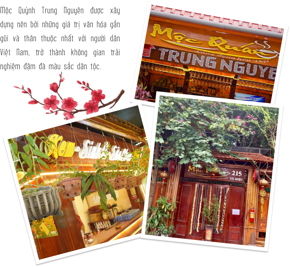 Đi theo phong cách thuần Việt, Mộc Quỳnh Trung Nguyên chọn lối thiết kế phóng khoáng, gần gũi, sử dụng nhiều nội thất bằng gỗ để tạo cảm giác thân thuộc. Ngay cả cái tên thương hiệu cũng đã toát lên sự giản dị, mộc mạc khiêm nhường. Vậy vì sao chị lại lựa chọn hướng đi này cho thương hiệu của mình?