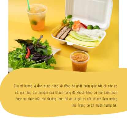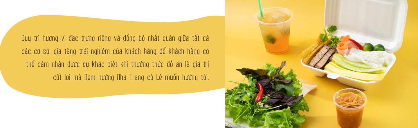 Theo chị nhận thấy, “Đặc sản không có nghĩa là ngon, sự khác biệt cũng không hẳn sẽ thỏa mãn được khẩu vị của tất cả mọi người, nhưng thương hiệu tạo ra được một công thức chế biến giữ được sự đặc trưng riêng biệt và nhận được sự đón nhận của số đông khách hàng chắc chắn đã là một thành công trong hành trình phát triển”. Đó là tiêu chí để Nem nướng cô Lê phát triển bền vững và có sự tăng trưởng chuỗi cửa hàng nhanh như vậy. Một thương hiệu không tạo ra được sự khác biệt thì sẽ khó mà định vị được vị thế trên thị trường, nơi đầy rẫy những đối thủ cạnh tranh tiềm năng đang có ý định chiếm đóng thị phần. Hiện tại, “Duy trì hương vị đặc trưng riêng và đồng bộ nhất quán giữa tất cả các cơ sở, gia tăng trải nghiệm của khách hàng để khách hàng có thể cảm nhận được sự khác biệt khi thưởng thức đồ ăn là giá trị cốt lõi mà Nem nướng Nha Trang cô Lê muốn hướng tới”. Và thương hiệu Nem nướng Nha Trang cô Lê đang trong quá trình hoàn thiện giá trị cốt lõi của mình.