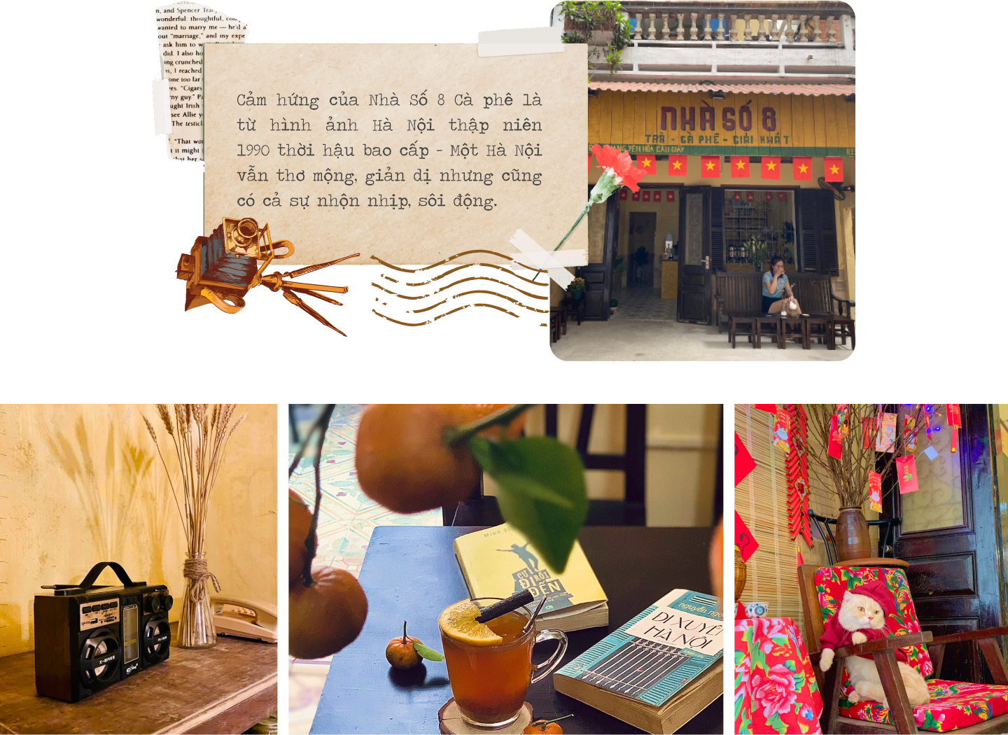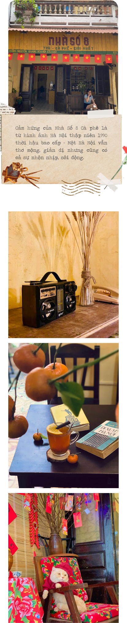 Để decor theo đúng concept, chị đã phải tốn khá nhiều thời gian sưu tầm những vật dụng có tuổi đời từ hồi 1990 như bàn ghế gỗ cũ, lọ hoa cũ, TV đen trắng, loa phát thanh,... Sau này có nhiều khách hàng tới Nhà Số 8, thích concept của quán quá nên họ cũng tặng lại cho mình một số đồ vật lâu năm trong nhà để quán trưng bày. Vào mỗi dịp lễ Tết, quán sẽ bày biện, vừa tạo sự mới mẻ, vừa giúp mọi người biết thêm những năm 1990 ấy người Hà Nội trang trí nhà cửa đón những ngày lễ này như thế nào.