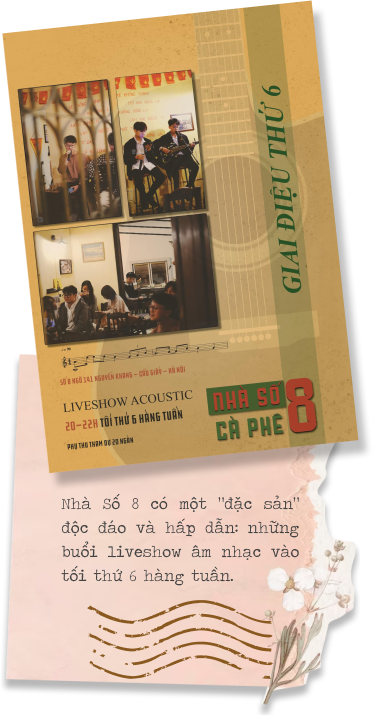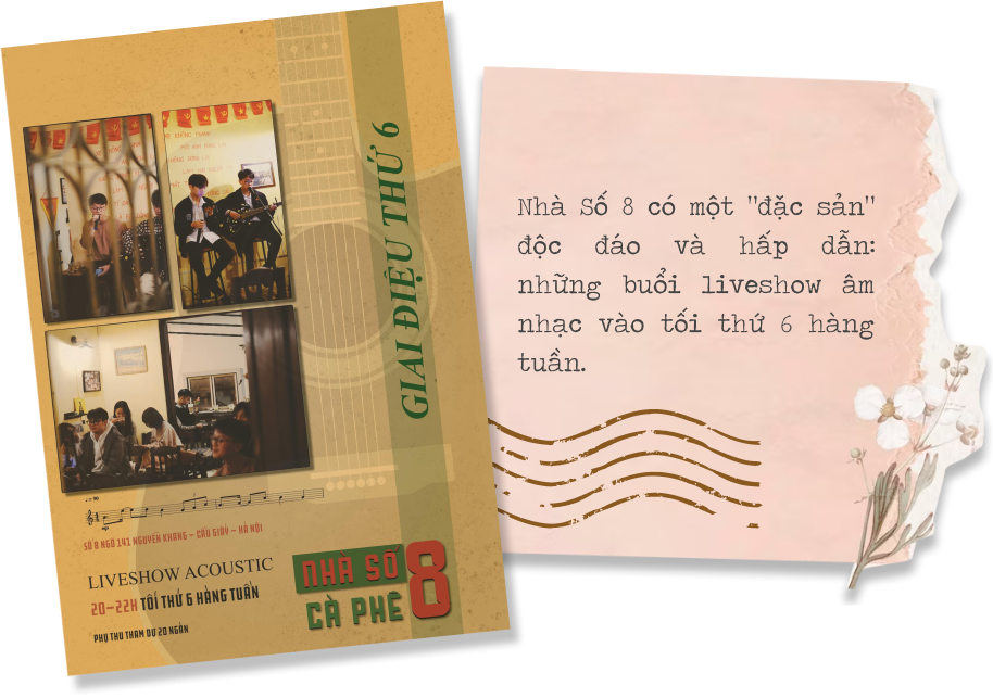 Vào thứ 6, quán sẽ thay đổi đôi chút trong cách sắp xếp bàn ghế ở khu vực tầng 2 (nơi diễn ra liveshow) để tiện cho mọi người ngồi thưởng thức âm nhạc tốt nhất. Buổi biểu diễn cũng được livestream lại trên fanpage của Nhà Số 8, nếu khách hàng nào lỡ bỏ qua buổi liveshow trực tiếp tại quán đều có thể xem lại trên fanpage.
