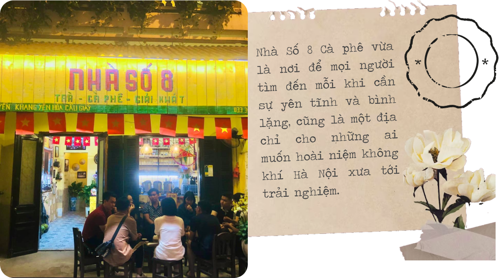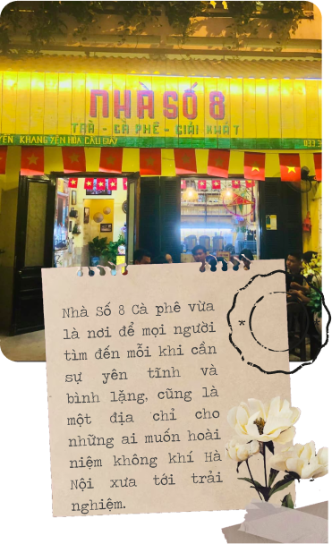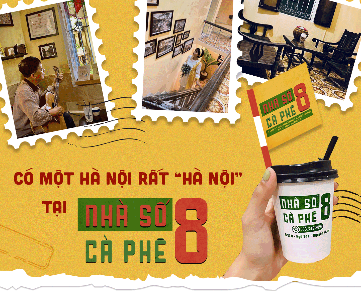 Bước chân vào quán là thấy hơi thở vintage ngập tràn với những mảng tường sơn vàng, gạch hoa lát sàn kiểu phổ biến những năm 80-90, song cửa sổ đậm màu thời gian hay bộ bàn ghế gỗ cũ,... Ngồi ở Nhà Số 8, nhâm nhi một ly cà phê phin nóng ấm, ngắm mưa xuân bay bay và đắm mình trong tiếng hát của danh ca Cẩm Vân, cứ ngỡ bản thân vừa bước lên một cỗ máy thời gian và quay về Hà Nội của thời “ông bà anh”.