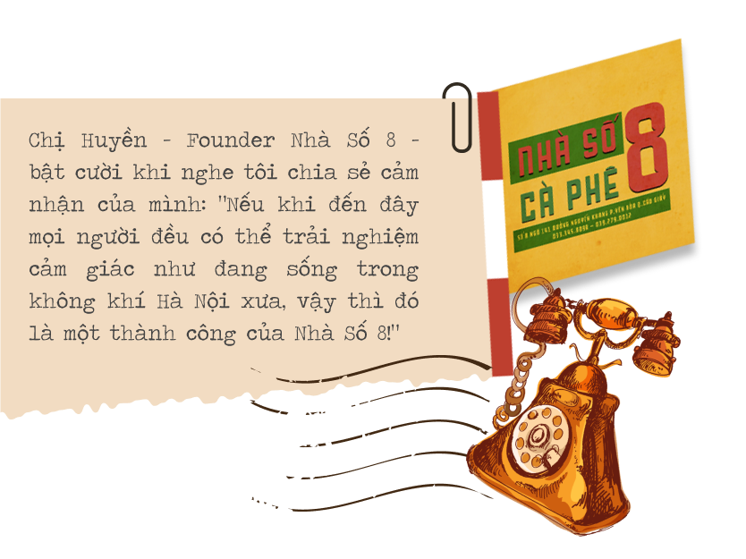 Tuy ước mơ đó được ấp ủ từ lâu nhưng phải đến năm ngoái, khi đã chuẩn bị hoàn tất về mọi mặt và thị trường cũng ổn định lại sau 2 năm dịch bệnh, chị mới chính thức khai trương Nhà Số 8 Cà phê. Mục tiêu của chị khi xây dựng Nhà Số 8 không chỉ là một nơi yên tĩnh cho khách hàng đến thư giãn, nghỉ ngơi hoặc chuyện trò; mà còn là một địa chỉ cho những ai muốn hoài niệm không khí Hà Nội xưa tới trải nghiệm.