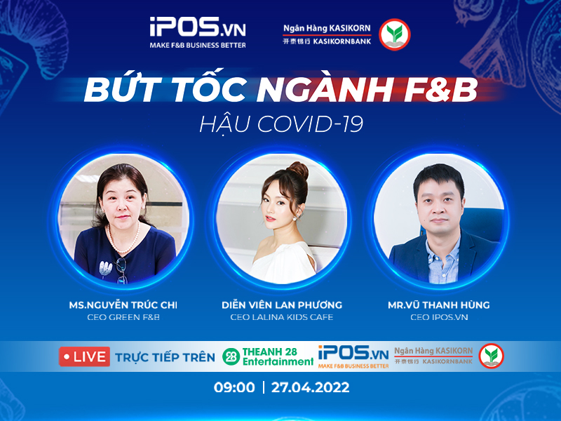 Sự kiện tọa đàm trực tuyến Bứt tốc ngành F&B hậu Covid-19 đã diễn ra thành công tốt đẹp vào sáng ngày 27/04/2022 vừa qua. Chương trình có sự góp mặt của 3 diễn giả: Diễn viên Lan Phương – Giám đốc Lalina Kids Cafe, bà Nguyễn Trúc Chi – Giám đốc Green F&B Việt Nam và ông Vũ Thanh Hùng – Giám đốc công ty iPOS.vn.