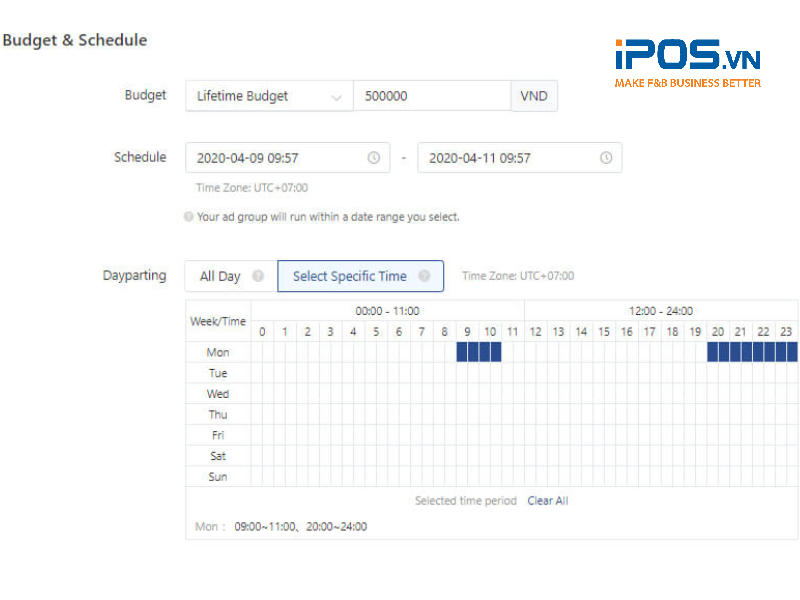 - Ở phần Dayparting sẽ cho phép người tạo quảng cáo lựa chọn cụ thể thời điểm quảng cáo được hiển thị trong ngày.