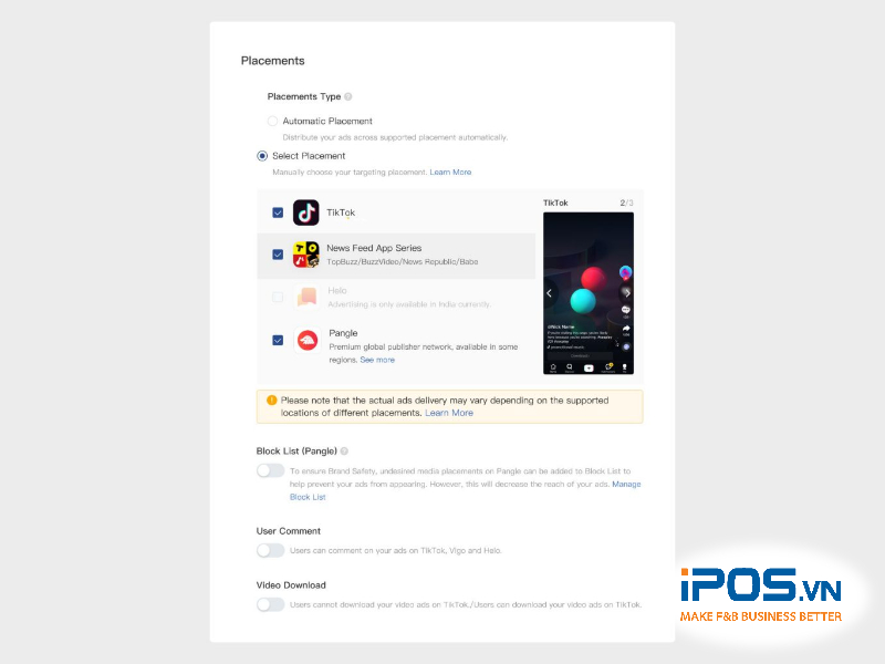Tùy theo nhu cầu và mục đích của người tạo mà có thể lựa chọn vị trí hiển thị quảng cáo khác nhau như vị trí ở tranh chính TikTok, các ứng dụng khác như BuzzVideo hoặc NewsRepublic, trên Pangle là mạng lưới người dùng của TikTok, hoặc Automatic là cho phép TikTok tự động tối ưu hóa việc phân phối quảng cáo. Thông thường, mọi người sẽ lựa chọn vị trí ở trang chính TikTok, khi đó quảng cáo định dạng In Feed sẽ hiện lên ở mục For You – Dành cho bạn.