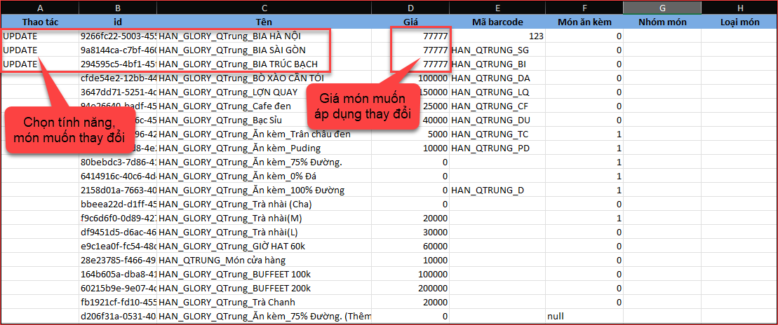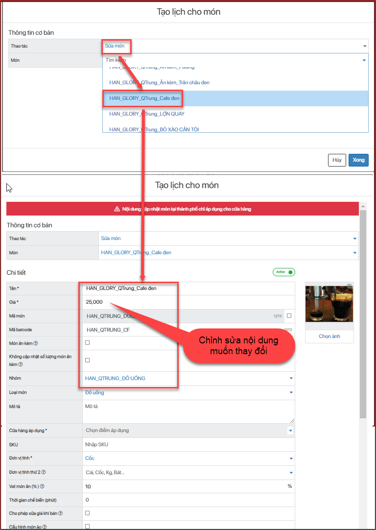 - Bước 3: Cấu hình nội dung muốn thay đổi trên chi tiết món ăn (ví dụ đổi giá món, tên món….)